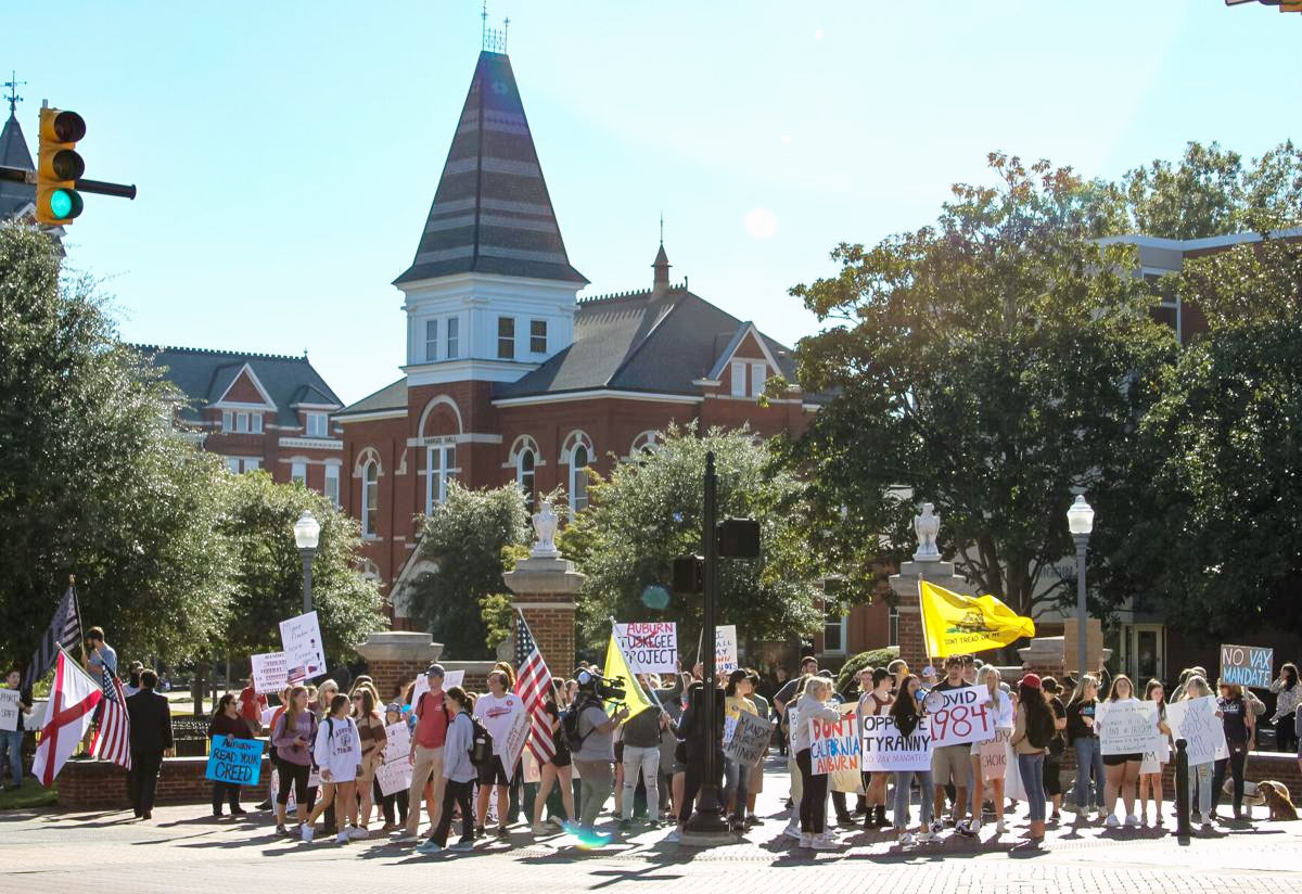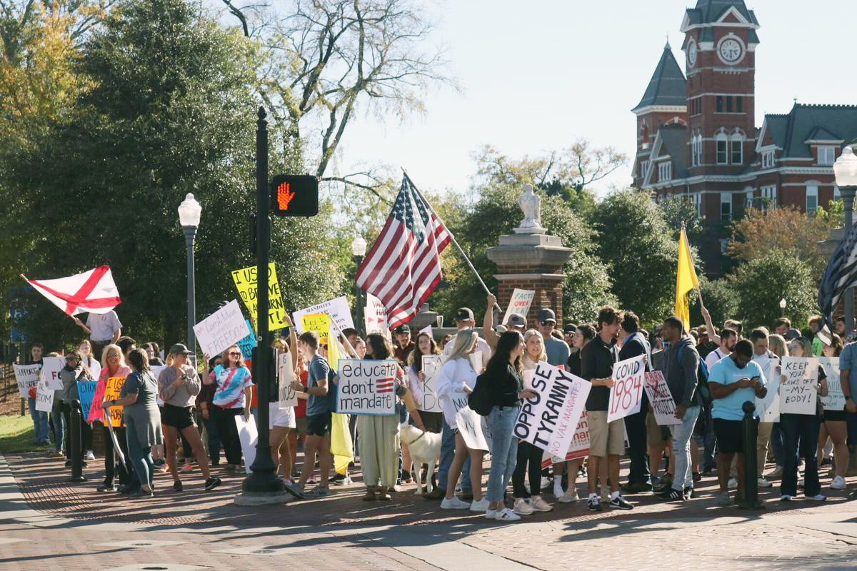 뉴스에 따르면 투머스 코너(Toomer’s Corner)에서 열린 이날 시위는 자칭 ‘@Noforcedvaxedauburn'(강제백신반대어번)이라는 단체가 주도했으며, 150명 이상이 모였던 것으로 알려졌다. 보수매체 RSBN은 이날 시위 현장을 스트리밍으로 생중계하기도 했다.