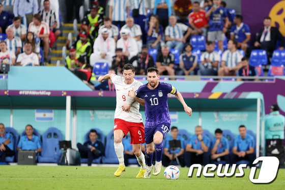 아르헨티나 리오넬 메시와 폴란드 로베르트 레반도프스키가 30일 저녁(현지시간) 카타르 도하 스타디움974에서 열린 2022카타르 월드컵 조별리그 C조 3차전 폴란드와 아르헨티나의 경기 후반전에서 볼 다툼을 벌이고 있다. 2022.12.1/뉴스1 © News1 이동해 기자