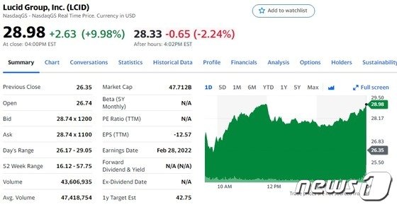 지난달 28일(현지시간) 뉴욕증시에서 루시드의 주가는 전거래일보다 9.98% 폭등한 28.98달러를 기록했다.