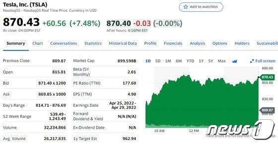 이날 루시드 이외의 다른 전기차주도 일제히 급등했다. 테슬라는 전거래일보다 7.48% 급등한 870.43달러를 기록했다.