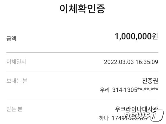 한편 진 전 교수는 러시아 침공으로 위태롭고 힘든 나날을 보내고 있는 우크라이나 국민들을 위해 지난 3일 후원금 100만원을 주한 우크라이나 대사관 앞으로 보냈다며 계좌이체 내역을 공개했다.