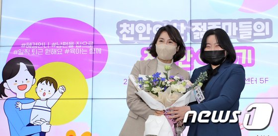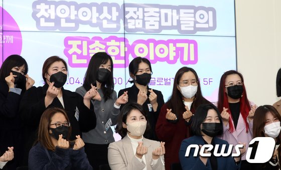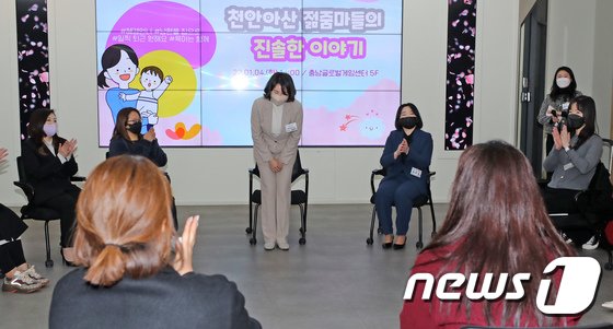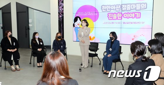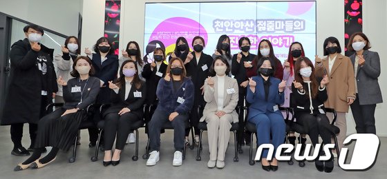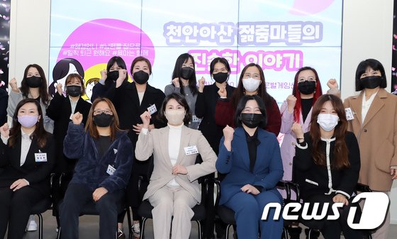 이재명 더불어민주당 대선 후보의 배우자 김혜경씨가 4일 충남글로벌게임센터에서 ‘천안아산 젊줌마’ 워킹맘들을 만나 친근감을 표시하며 진솔한 이야기를 나눴다.