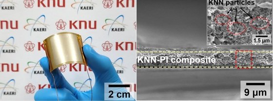 고온환경 작동형 플렉시블 압전소자 모습(왼쪽)과 (K,Na)NbO3계 압전 분말과 폴리이미드 고분자 복합체 단면. (원자력연 제공) © 뉴스1