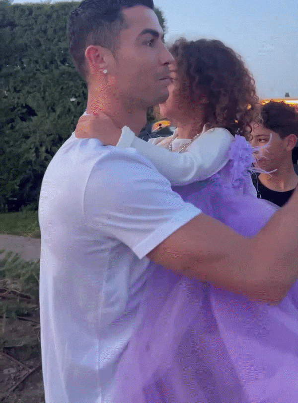 빨간 드레스를 입은 조지나는 호날두를 데리고 정문으로 향했다. 이윽고 선물을 본 호날두는 눈이 휘둥그레지더니, 안고 있던 딸을 바닥에 내려놓으며 웃음을 참지 못했다.