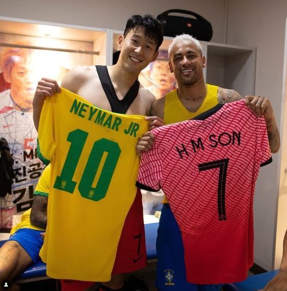 한국 축구대표팀의 주장 손흥민(토트넘)과 브라질 축구대표팀의 에이스 네이마르(파리생제르맹)가 경기 후 라커룸에서 사이 좋게 유니폼을 교환했다.