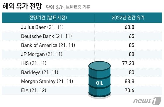 영국계 자산운용사 슈로더는 “국제 유가가 올해 배럴당 100달러 넘게 오를 수 있다”라면서 “가장 큰 (유가 하락) 리스크는 이란의 원유 수출 재개로, 그러면 원유 시장은 초과 공급으로 전환돼 가격이 60달러까지 하락할 수 있다”고 분석했다.