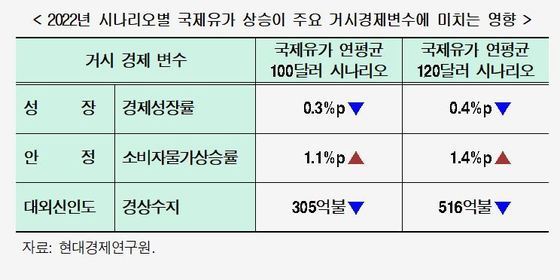 올해 유가 급등에 따른 구체적인 성장 하락 시나리오도 제시됐다. 현대경제연구원은 작년 10월 보고서에서 국제유가가 연평균 100달러로 오를 경우 소비자물가 상승률은 1.1%포인트(p) 상승, 연간 성장률과 경상수지는 0.3%p 하락할 것이라고 예상했다.