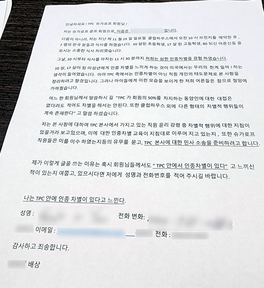 문서에는 자신의 실명과 연락를 밝한 Y씨가 지난 해 11월 19일(일) 클럽하우스에서 직원으로부터 심한 인종차별을 경험했다면서 “TPC 안에서 인종차별이 있다”고 느낀 다른 회원이 있는지를 확인하는 내용을 담고 있다.