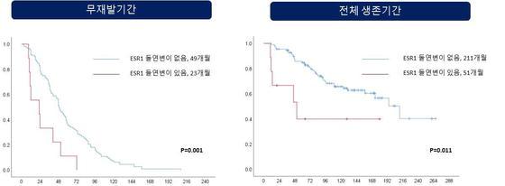 분석 결과, 전체 121명의 환자 중 9명(7.4%)에서 ESR1 돌연변이가 검출됐다. 돌연변이가 있는 환자의 유방암 무재발기간은 23개월로, 돌연변이가 없는 환자의 무재발기간 49개월과 비교해 유방암 재발 시기가 빠른 것으로 나타났다(그림 2).