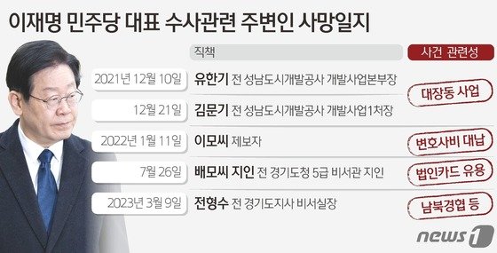 ‘더이상의 희생은 없어야 한다’는 대목은 이 대표 주변인물 중 유명을 달리한 사례는 전씨가 다섯번째인데 각종 의혹사건에 연루된 피의자 또는 참고인들의 피해가 더이상 발생하면 안된다는 취지로 읽힌다.