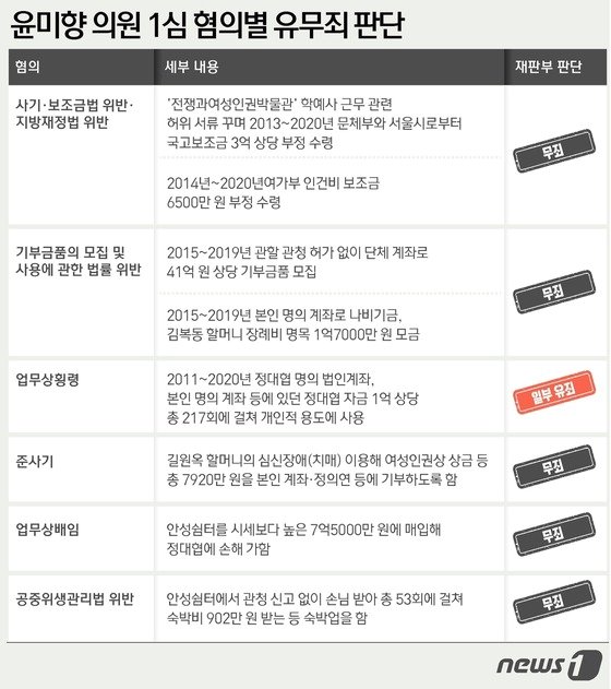 1심 재판부는 이 중 명확히 자금을 유용하거나 고의·불법영득의사가 인정된 항목만을 유죄로 봤다. 증빙이 없더라도 정대협 활동에 쓰였을 가능성이 있으면 무죄로 간주했다.