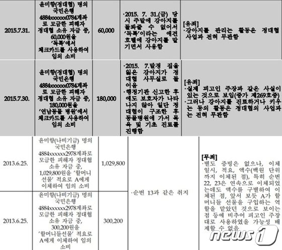 반면 증빙자료가 없더라도 ‘할머니 옷감’, ‘할머니 선물’ 등으로만 적요 기입된 항목 등에 대해서는 ‘실제 피고인 주장대로 사용됐을 가능성을 배제할 수 없다’며 무죄로 판단했다.