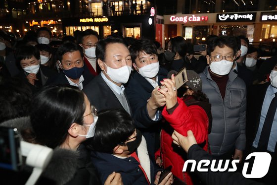 멀리서 윤 후보와 이 대표를 바라보던 30대 여성 2명은 곁으로 다가가 사진 촬영을 요청했다. 6살로 보이는 자신의 아들과 함께 거리를 찾은 한 30대 여성은 윤 후보를 보고 놀란 표정으로 환호하며 함께 사진을 찍기도 했다.