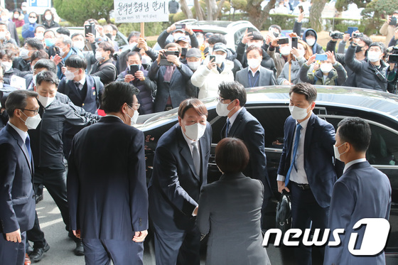 윤석열 검찰총장이 3일 오후 대구고검에 도착해 관용차에서 내리는 순간 지지자 등이 한꺼번에 몰려 출입구 주변에 혼잡이 빚어지고 있다. 2021.3.3/뉴스1 © News1 공정식 기자