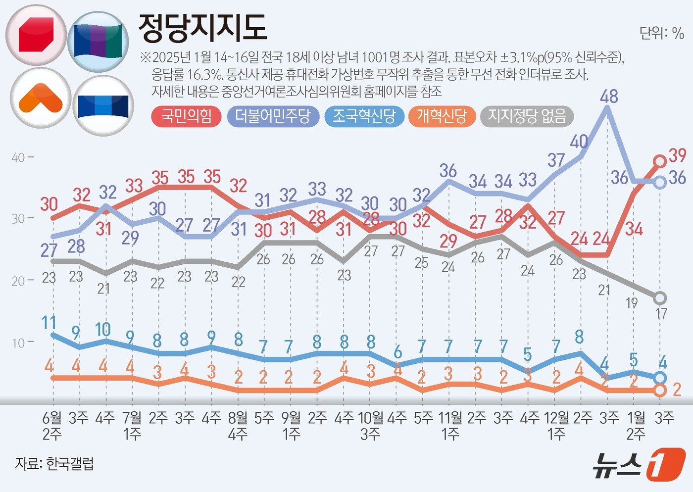 한국갤럽이 지난 14~16일 유권자 1001명을 대상으로 실시한 정당 지지도 조사에서 국민의힘은 39%, 민주당은 36%로 집계됐다. 지난해 12월 셋째 주 민주당(48%)이 국민의힘(24%)을 두 배 앞섰던 상황에서 한 달여 만에 민주당은 12%p 하락, 국민의힘은 15%p 상승하며 균형이 맞춰졌다.