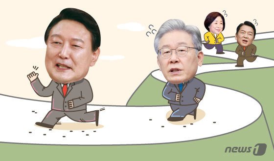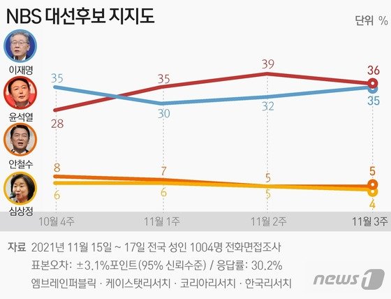 엠브레인퍼블릭·케이스탯리서치·코리아리서치·한국리서치 등 여론조사업체 4개사가 성인 남녀 1004명을 대상으로 15~17일 실시해 이날 발표한 11월 3주차 전국지표조사(NBS·National Barometer Survey)를 보면, 윤 후보는 ‘대선후보 지지도’에서 36%, 이 후보는 35%를 기록해 접전을 벌였다.