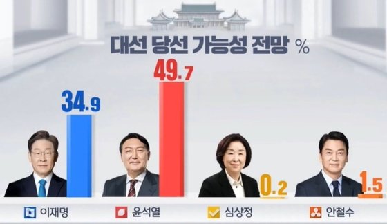 지지 여부와 상관없이 어떤 후보가 당선될 가능성이 높다고 생각하느냐는 질문에는 윤석열 후보가 49.7%를 얻어 50%에 근접하며 34.9%에 그친 이재명 후보에게 14.8%p 앞섰다.