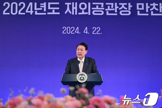 윤석열 대통령이 22일 서울 중구 롯데호텔에서 열린 재외공괸장 만찬에서 모두발언을 하고 있다. (대통령실 제공) 2024.4.22/뉴스1 © News1 오대일 기자