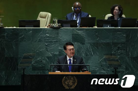 윤석열 대통령이 지난 20일(현지시간) 미국 뉴욕 유엔(UN) 본부에서 열린 제78차 유엔 총회 고위급 회기에서 기조연설을 하고 있다. (대통령실 제공) 2023.9.21/뉴스1 © News1 안은나 기자