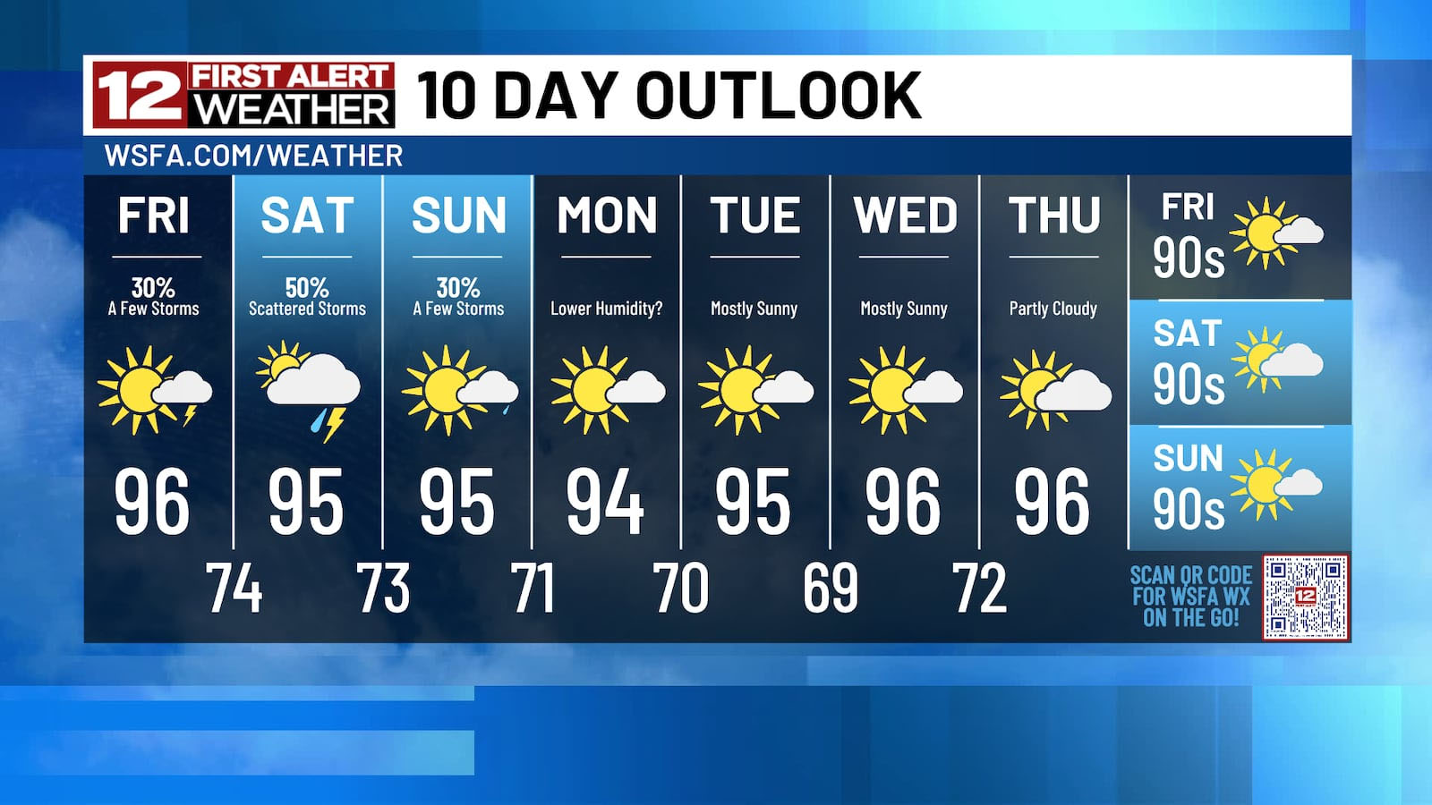 금요일은 대체로 맑으나 더운 날씨 속에서 하루가 지나가겠다. 일부 지역에서는 오후나 저녁에 비가 잠깐 내리겠지만 그것은 예외적인 것일 뿐이라고 WSFA 12 뉴스는 보도했다. 주말에 악천후가 다가오기 때문이다.