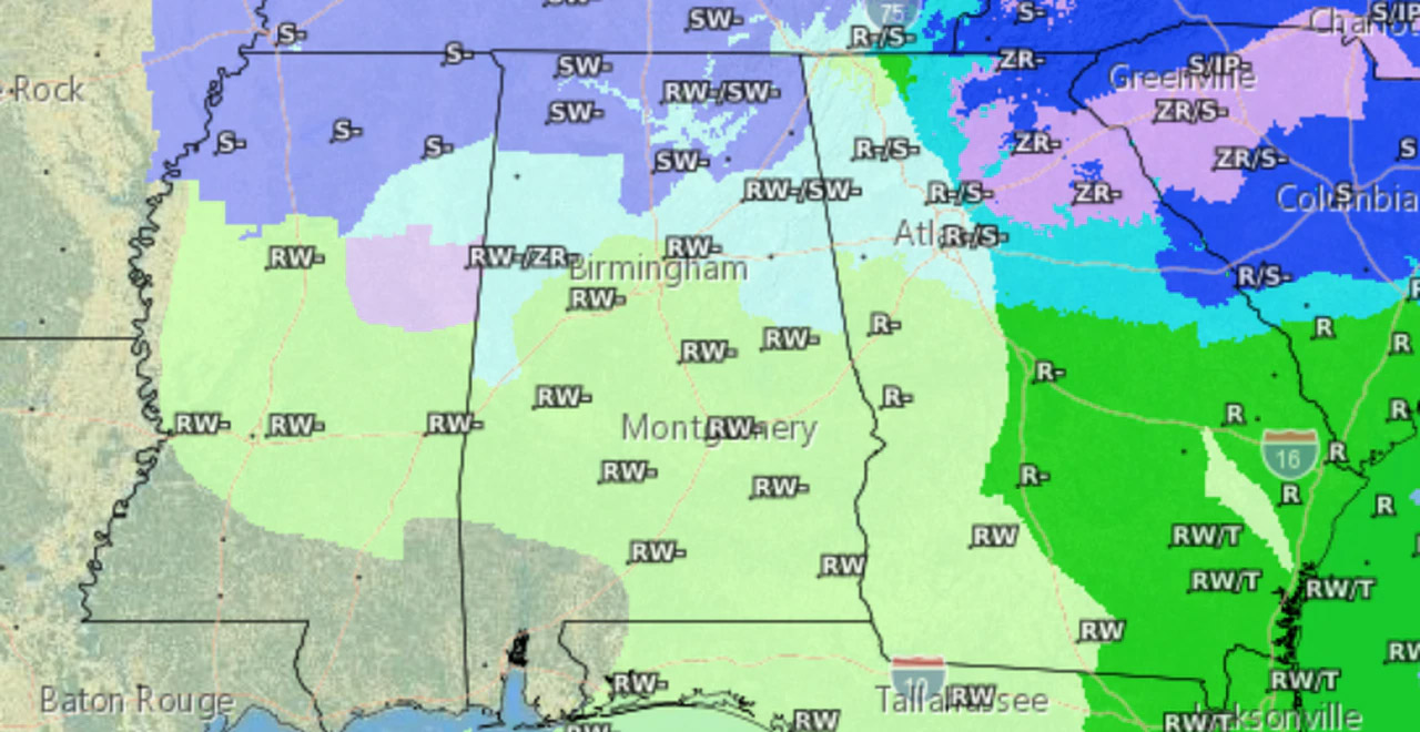 기상 통보관에 따르면, 앨라배마주 북부와 북중부에 눈이 내릴 가능성이 있으며, 더 남쪽 지역에 비와 눈이 섞일 가능성이 있다고 한다.
