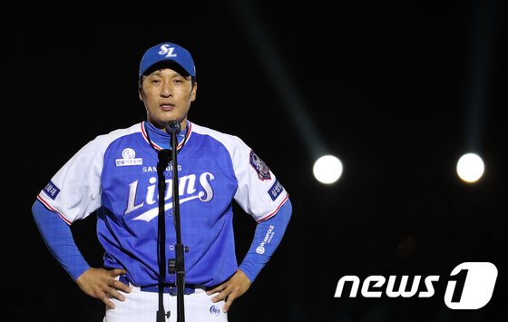 이승엽 삼성라이온즈 선수가 3일 오후 대구 삼성라이온즈파크에서 열린 은퇴식에서 고별사를 하고 있다. 2017.10.3/뉴스1 © News1 이종현 기자