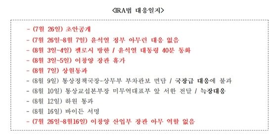 다만 IRA 초안 공개 이후 상원에서 통과된 8월7일까지 약 열흘 동안 정부에서는 아무런 역할을 하지 않았다는 것이 이 의원 측의 지적이다.