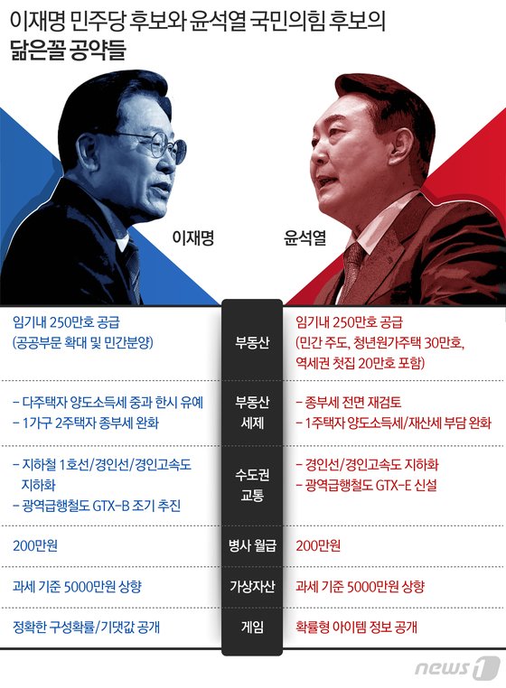 22일 두 후보가 내놓은 공약을 분석한 결과 부동산 정책과 가상자산 소득에 대한 과세 기준, 병사 월급 공약 등의 내용이 일치하는 것으로 나타났다. 이번 대선에서 캐스팅 보트로 떠오른 2030 젊은 세대와 중도층을 향한 경쟁적인 구애가 이같은 결과를 낳았다는 분석이다.