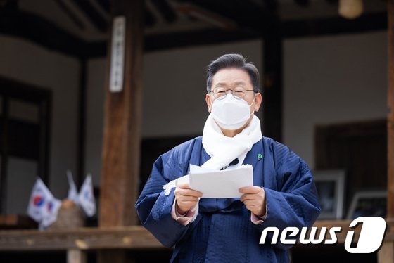 이재명 더불어민주당 대선 후보가 설 명절인 1일 고향인 경북 안동을 찾아 ‘경북 7대 공약’을 발표하고 있다. (더불어민주당 선대위 제공) 2022.2.1/뉴스1 © News1 이동해 기자