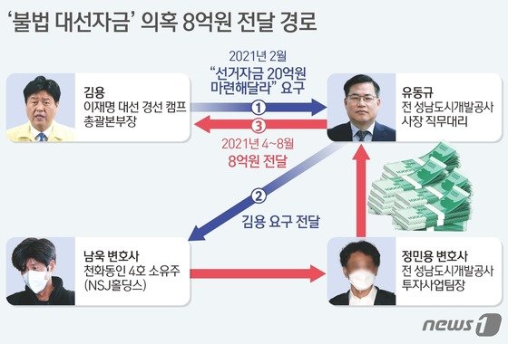 검찰은 이처럼 자금의 최초 출처는 남욱 변호사이고 이후 ‘정민용→유동규→김용’으로 순차 전달된 정황과 진술을 확보한 것으로 전해졌다. 검찰은 김 부원장의 압수수색 영장 등에 8억원의 성격을 ‘정치자금 기부’로 명시했다.
