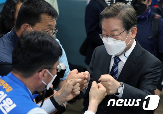 인천 계양을 국회의원 보궐선거에 출마한 이재명 더불어민주당 상임고문이 지난 16일 인천시 미추홀구 박남춘 인천시장 후보 선거사무소에서 열린 ‘6·1 지방선거 더불어민주당 인천시 통합선거대책위원회 출범식’에서 당원들과 주먹인사를 하고 있다.2022.5.16/뉴스1 © News1 정진욱 기자