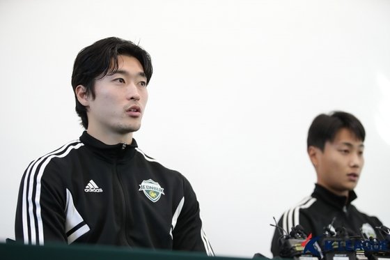 조규성은 12일 전북 완주의 전북 현대 클럽하우스에서 기자들과 만나 이적설에 대한 입장을 밝혔다.