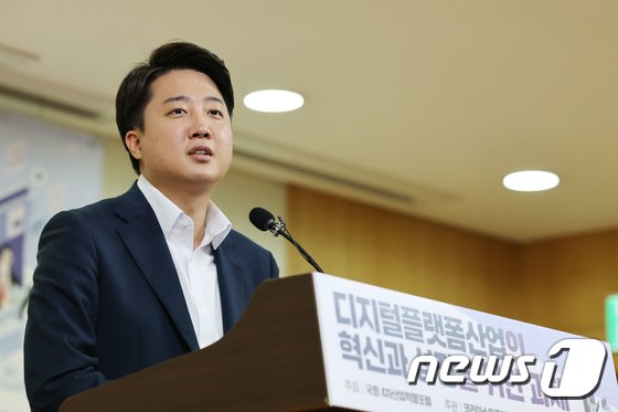 이준석 국민의힘 대표가 15일 오후 서울 여의도 국회 의원회관에서 열린 '디지털플랫폼산업의 혁신과 성장을 위한 과제'를 주제로 한 토론회에 참석해 축사를 하고 있다. (공동취재) 2022.6.15/뉴스1 © News1 허경 기자