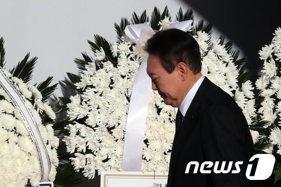 윤석열 대통령이 4일 오전 서울광장에 마련된 이태원 사고 사망자 합동분향소를 찾아 조문하고 있다. 2022.11.4/뉴스1 © News1 황기선 기자