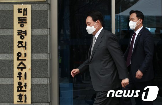 윤석열 대통령 당선인이 25일 서울 종로구 통의동 인수위 집무실에서 점심식사를 위해 이동하고 있다. 2022.3.25/뉴스1 © News1 오대일 기자