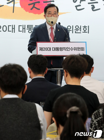 박성중 인수위 과학기술교육분과 간사가 26일 서울 종로구 통의동 제20대 대통령직인수위원회 공동기자회견장에서 '4차 산업혁명시대, 미래사회를 선도할 수 있는 디지털 인재 양성' 관련 브리핑을 하고 있다. 2022.4.26/뉴스1 © News1 인수위사진기자단