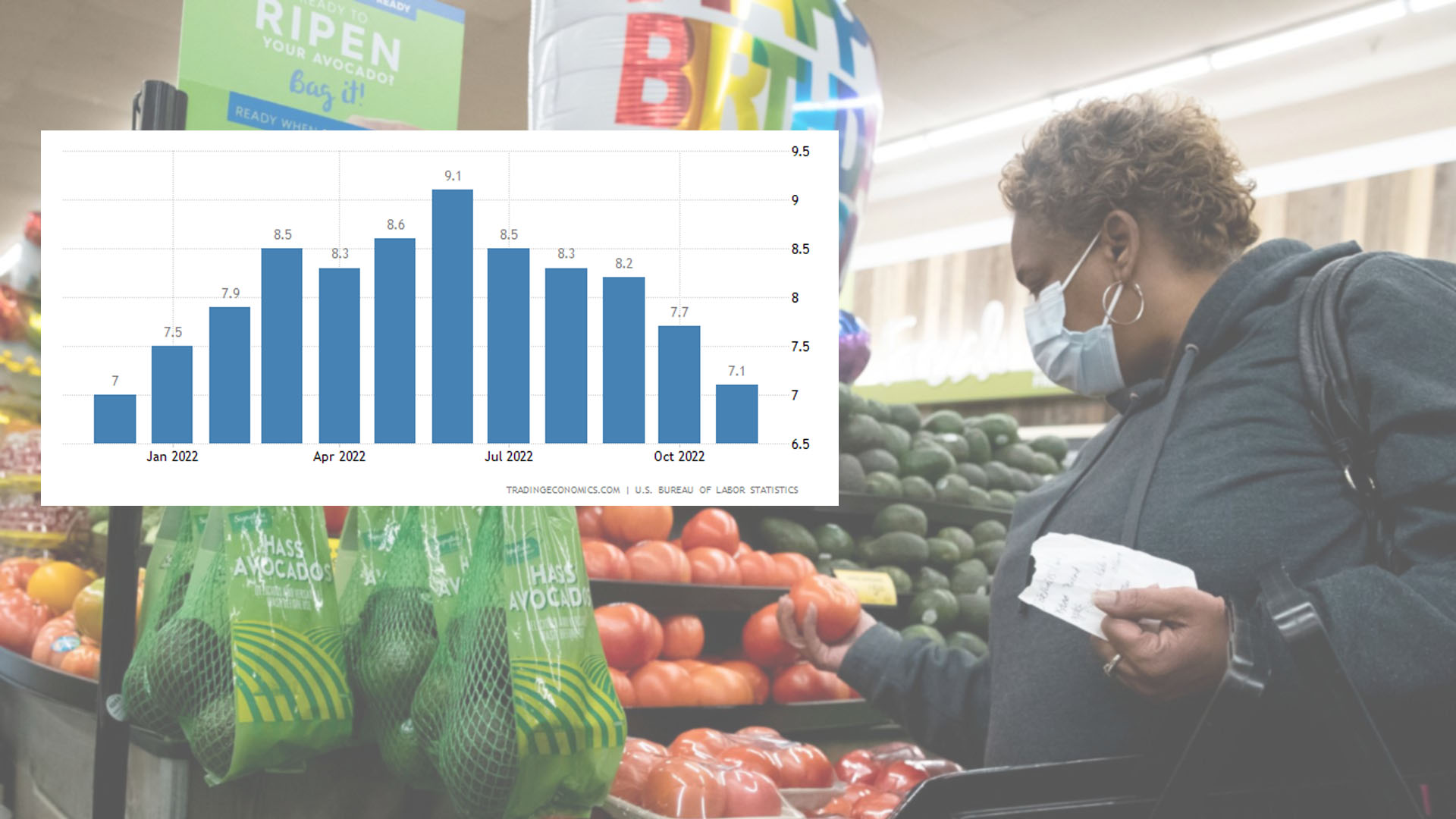 13일(현지시간) 미 노동통계국에 따르면 11월 소비자물가지수(CPI) 상승률은 전년비로 7.1%를 기록해 예상(7.3%)과 전월(7.7%)을 하회했다. 5개월 연속 둔화한 것으로 지난해 12월 이후 1년 만에 최저다.