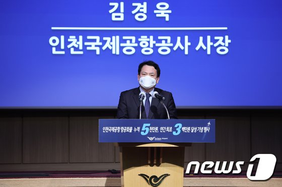 2일 인천국제공항공사에서 열린 ‘인천공항 항공화물 누적 5천만 톤 및 연간 최초 3백만 톤 달성 기념행사’에서 김경욱 사장이 환영사를 하고 있다. 코로나19 장기화에 따른 항공화물수요 증가로 인천공항은 개항 20년 만에 누적 항공화물 5천만 톤, 연간 항공화물 3백만 톤을 달성했다. 2021.12.2/뉴스1 © News1 안은나 기자