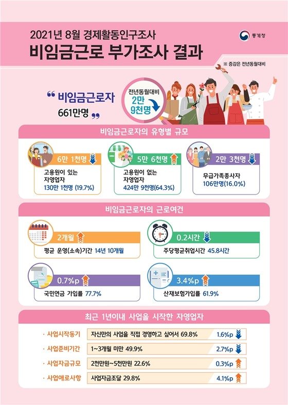 통계청이 4일 펴낸 ‘2021년 8월 비임금근로 및 비경제활동인구 부가조사 결과’를 보면 비임금근로자는 661만명으로 전년동월대비 2만9000명 감소했다. 이는 관련 통계를 집계하기 시작한 1982년 8월 이래 가장 적은 수치다.