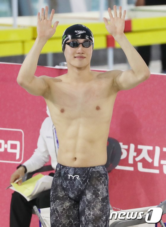 한국 수영의 간판 황선우(강원도청)가 10일 오후 울산 남구 문수실내수영장에서 열린 제103회 전국체육대회 수영 남자일반부 자유형200m 결승을 앞두고 관중석을 향해 손을 흔들고 있다. 이날 황선우는 1분44초67의 전국체전 신기록을 세우며 1위를 차지했다. 2022.10.10/뉴스1 © News1 윤일지 기자