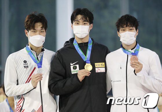 한국 수영의 간판 황선우(강원도청)가 10일 오후 울산 남구 문수실내수영장에서 열린 제103회 전국체육대회 수영 남자일반부 자유형200m 결승에서 1위로 골인 후 시상식에서 금메달을 목에 걸고 기념 촬영을 하고 있다. 이날 황선우는 1분44초67의 전국체전 신기록을 세우며 1위를 차지했다. 2022.10.10/뉴스1 © News1 윤일지 기자