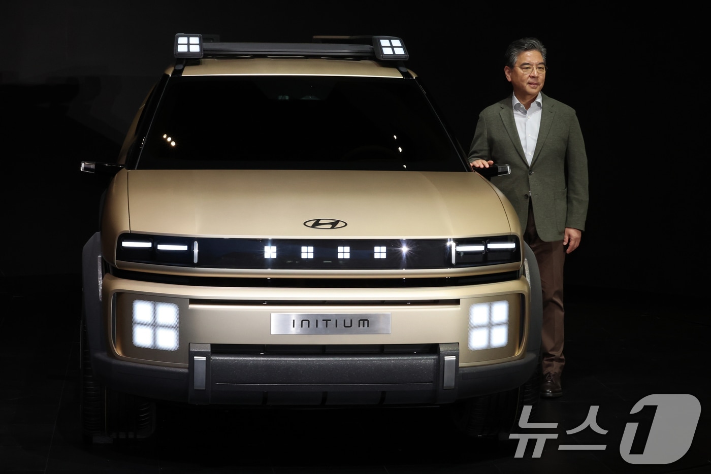 장재훈 현대자동차 사장이 31일 오전 경기 고양시 일산서구 현대 모터스튜디오에서 수소전기차 콘셉트카 '이니시움'과 함께 포즈를 취하고 있다. ‘이니시움’은 현대차가 내년 상반기에 선보일 승용 수소전기차(FCEV)의 상품과 디자인 측면의 방향성을 담은 콘셉트 모델이다. 2024.10.31/뉴스1 ⓒ News1 황기선 기자