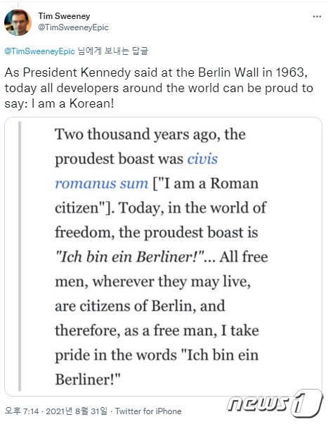 에픽게임즈 팀 스위니 CEO가 ‘구글갑질방지법’ 통과 소식을 환영하며 존 F. 케네디 대통령의 ‘나는 베를린 시민이다’ 연설에 빗대 “나는 한국인이다!”라고 언급했다. (팀 스위니 트위터 갈무리) © 뉴스1이에 대해 마크 레인 에픽게임즈 공동창립자 겸 부사장은 “이 말은 과장이 아니다. 정말 역사적인 날이다”며 “벽에 첫 균열이 일어나고 있으며, 머지않아 벽이 무너질 거다. (구글 갑질 방지법은) 더 나은 변화를 불러올 것”이라고 거들었다.