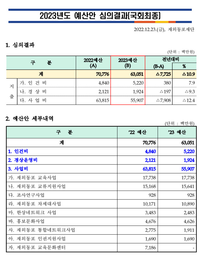 재단측이 공개한 2023년도 예산안 심의 결과 자료에 따르면, 총 9개의 주요 사업비 중 “재외동포 교육문화센터”는 전액 삭감됐으며, “재외동포 차세대사업”만 유일하게 올해보다 예산이 소폭 늘어났고, “조사연구사업”이 올해와 동일한 예산을 배정받았을 뿐, 나머지 사업들은 모두 축소된 것으로 나타났다.