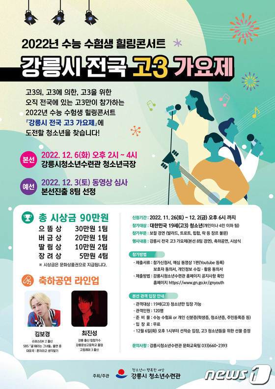 강원 강릉시는 수능시험을 마친 고3 학생들을 위해 오는 6일 청소년수련관 청소년극장에서 2022년 수능 수험생 힐링콘서트 ‘강릉시 전국 고3 가요제’를 개최한다고 2일 밝혔다.