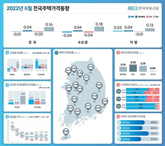 같은 기간 아파트와 연립주택, 단독주택을 모두 포함한 전국 주택가격은 -0.01%를 기록해 전월(0.01%) 상승에서 하락 전환했다. 전국 월별 집값이 하락한 것은 2019년 8월(-0.05%) 이후 2년10개월 만이다. 수도권은 -0.04% 하락폭을 유지했고, 지방은 0.06%에서 0.03%로 상승폭이 줄었다.