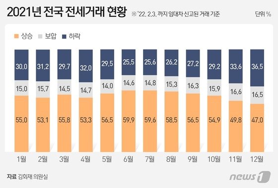 지난해 전세 신규 계약 중 하락·보합 거래 비중은 6월 40.1%로 2021년 중 가장 낮았지만, 7월 40.4%, 8월 41.5%, 9월 43.5%, 10월 45.1%, 11월 50.2%, 12월 53%로 6개월 연속 비중이 확대됐다.