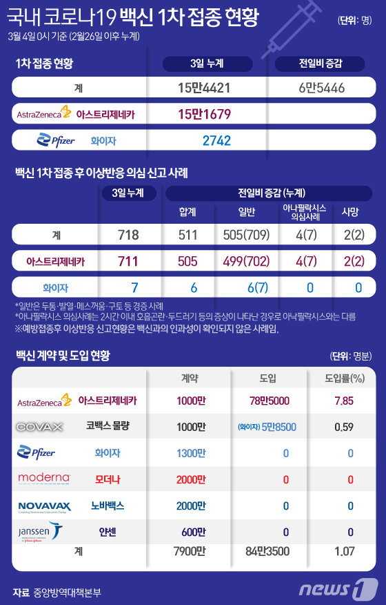 한편, 지난 4일 0시 기준 국내 접종자는 누적 15만4421명이다. 그중 아스트라제네카 백신 접종자가 15만1679명으로 다수를 차지한다. 같은 기간 화이자 백신 접종자는 2742명이다.
