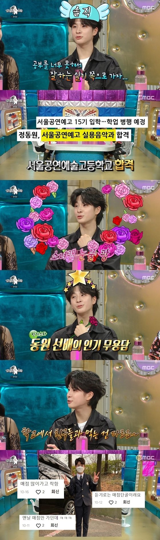 이후 김국진이 정동원을 향해 진학할 고등학교가 정해졌는지 물었다. 정동원은 “서울공연예술고 실용음악과에 합격했다”라고 대답했고, 모든 출연진들이 축하했다.