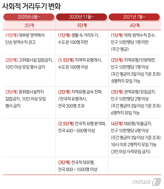 다만 정부는 새로운 거리두기 적용에 따라 느슨해질 수 있는 방역 경계심을 우려해 수도권 등 일부 지자체에 대해선 7월 14일까지 2주간 이행 기간을 둘 예정이다.